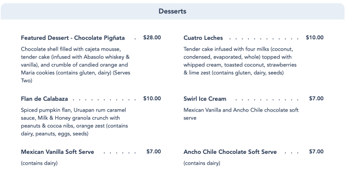 There are also plenty of desserts including the chocolate pigñata! For some spice, try the ancho chile chocolate soft serve.