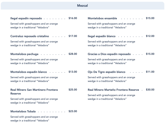 Frontera Cocina offers lots of alcoholic and specialty beverages including some classic cocktails and a mocktail.