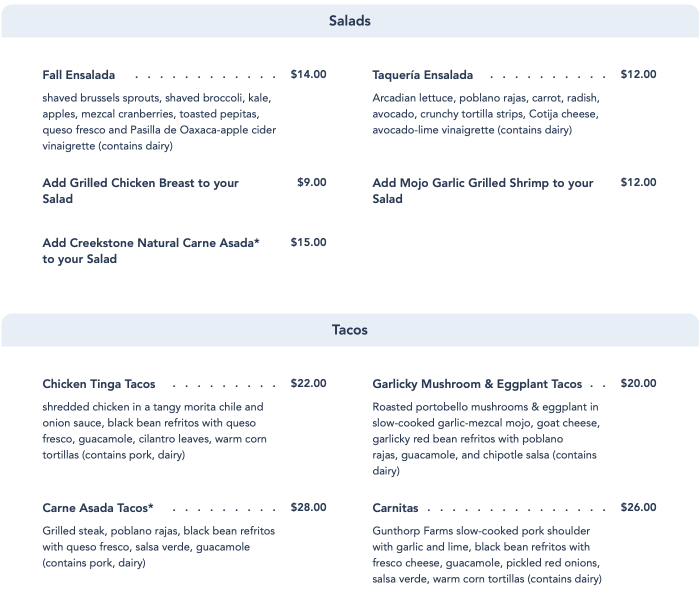 There are also some salads if you want a light start or easy meal and there are four types of tacos to choose from!
