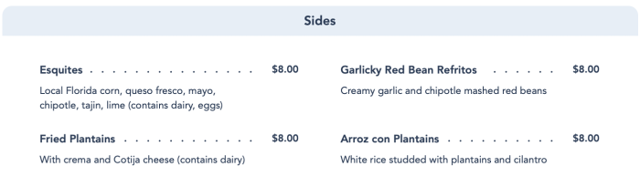 Esquites, fried plantains, garlicky red bean refritos, and arroz con plantains are available as sides.