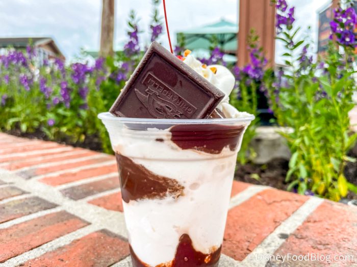 Over at the Ghirardelli Soda Fountain in Disney Springs, we tried out a new non-dairy dessert option! The Non-Dairy Hot Fudge Sundae is made with non-dairy chocolate chips and almond milk, over scoops of non-dairy Vanilla Coconut and finished with almond milk whipped topping, diced almonds, a cherry, and a 72% Dark Chocolate Square.