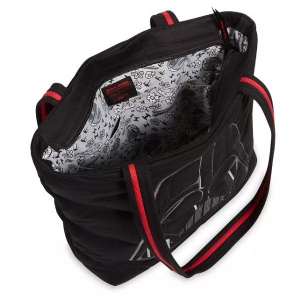 The Darth Vader Tote Bag has a very similar design to the backpack; the exterior has the same black fabric with the embroidered mask and the interior is lined with the same white and black patterned fabric. The long black handles each feature a stripe of vibrant red.