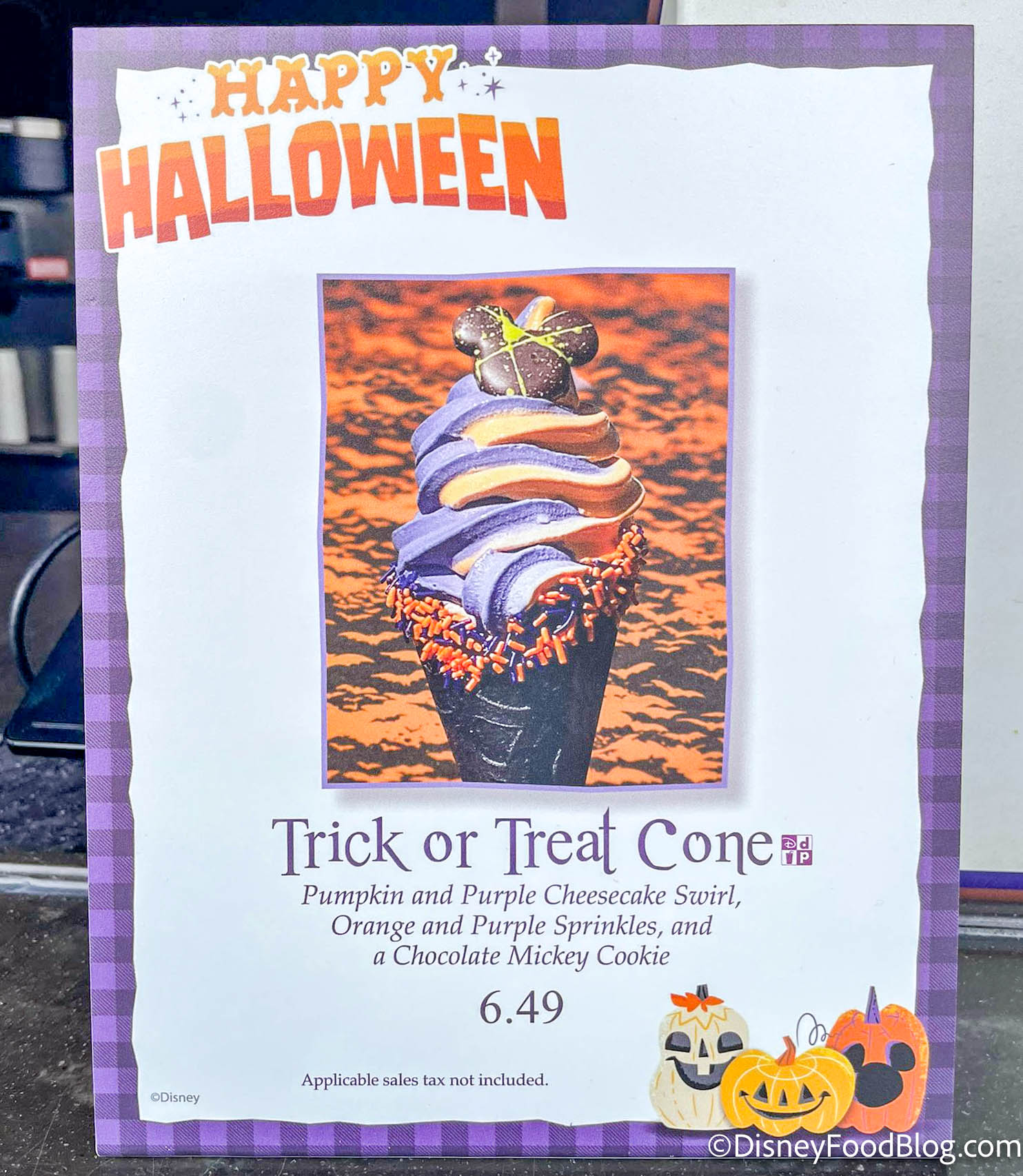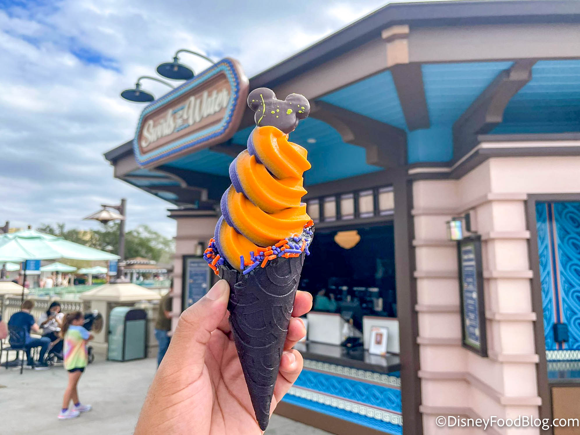 The Trick or Treat Cone is at Swirls on the Water! 🍦 Pumpkin & Purple Cheesecake swirl with orange and purple sprinkles and a chocolate Mickey cookie 🎃 Would you try it? pic.twitter.com/eK0Pv9JNev