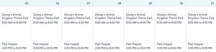 The only Disney Park that won’t be open until midnight on New Year’s Eve is Animal Kingdom, which will be open from 8AM to 8PM from December 25th to the 31st.