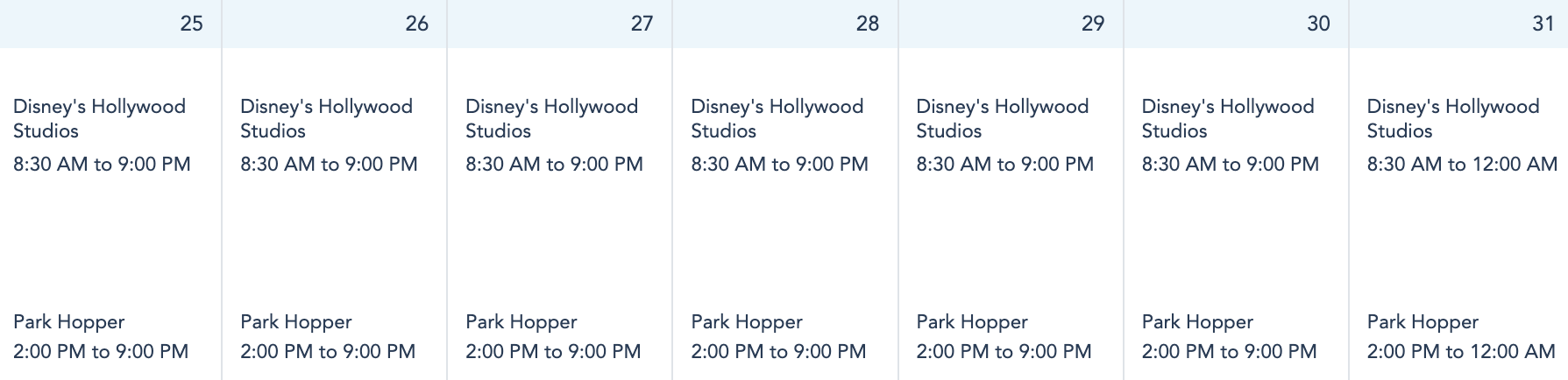 Over at Hollywood Studios, the park will be open from 8:30AM to 9PM from December 25th to the 30th.