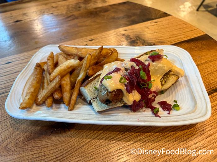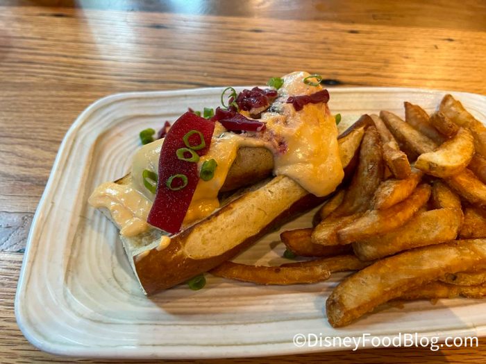 Over at GCH Craftsman Grill at the Grand Californian Hotel, you can grab the Oktoberfest Dog for $13.75. This is a bratwurst sausage in a pretzel bun topped off with beer cheese, mustard, and pickled red cabbage and onions. It also comes with a side of fries!