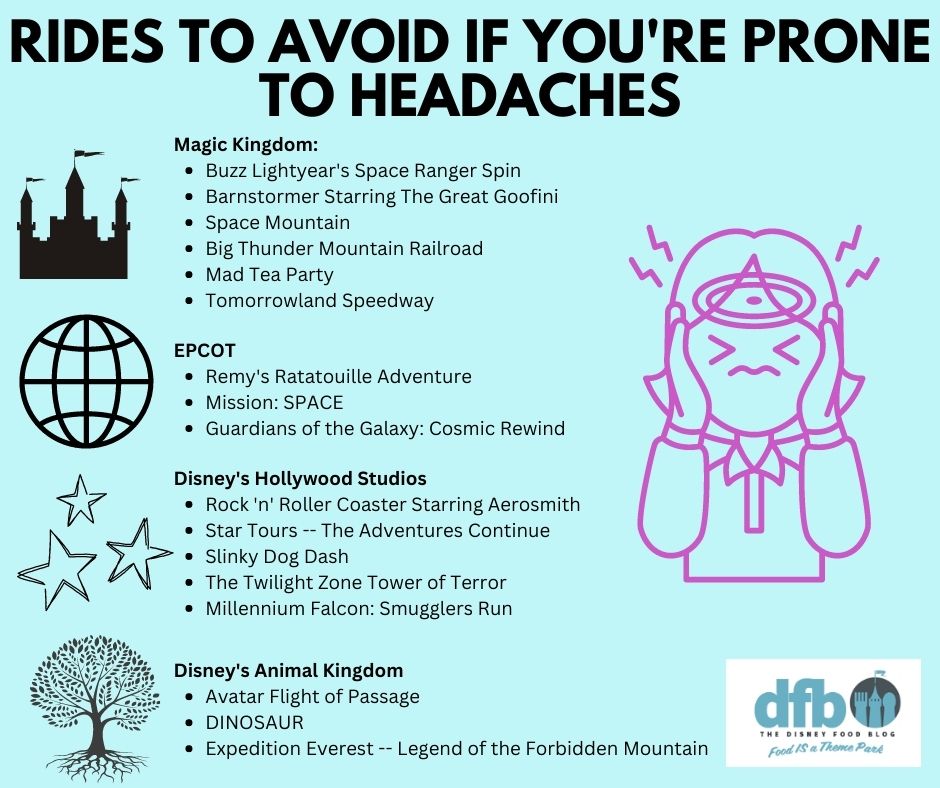 One of our DFB team members specifically noted that if they feel like a headache is coming on or if they’re just being particularly cautious since they are prone to headaches, they’d also avoid these rides:
