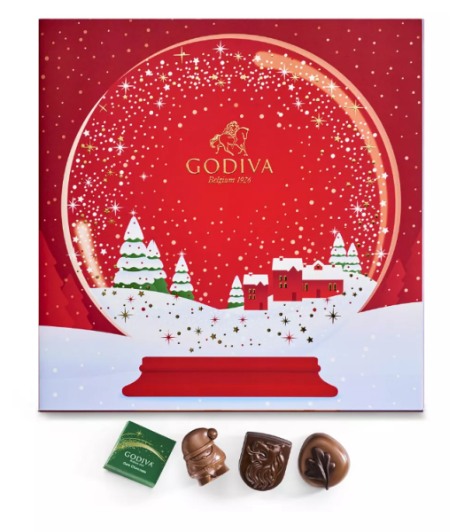 Godiva Chocolatier Holiday 2022 Red Advent Calendar – Snow Globe Gift Box with Assorted Dark, Milk and White Chocolates © Macy’s