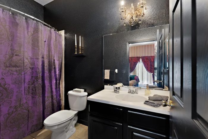 Even the bathroom will provide you with some SPOOKS! That dark color on the walls coupled with the purple and black shower curtain really gives this place an eerie feel.