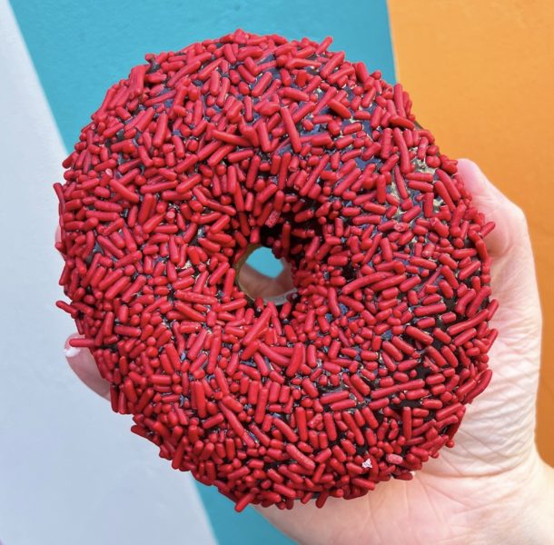 This donut appears to have chocolate frosting with lots of red sprinkles…