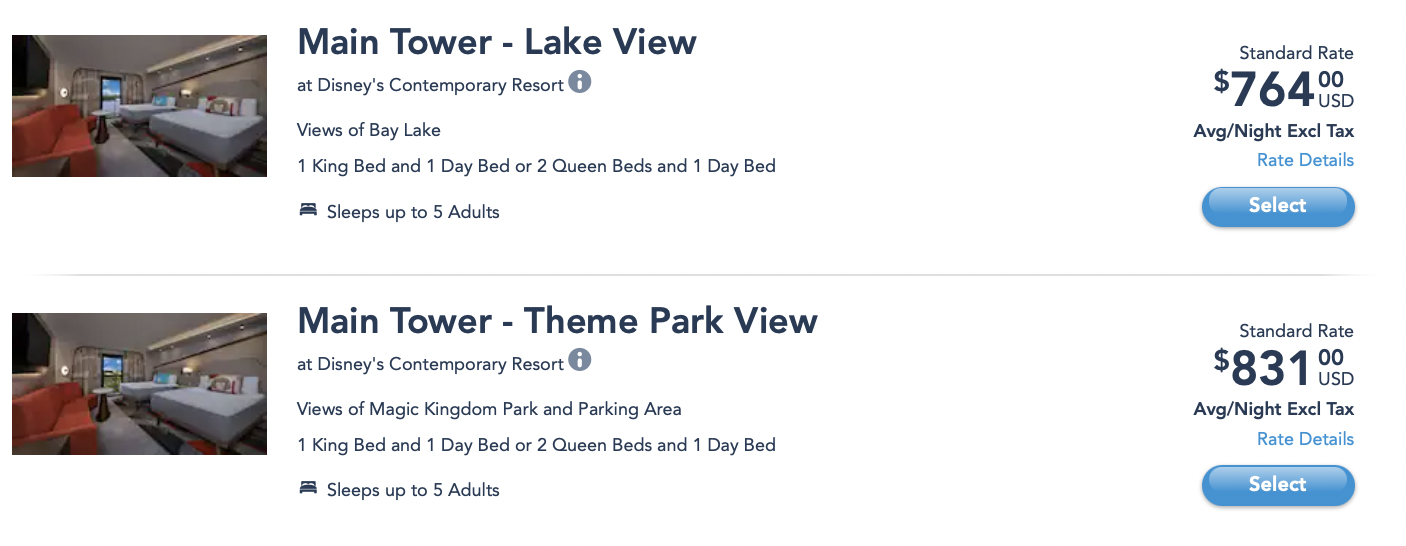 Over at the Contemporary, room prices look pretty similar. We also looked at prices for the rooms in mid-February 2023 and found that a main tower room with a lake view is $764 and the main tower room with a theme park view is $831.