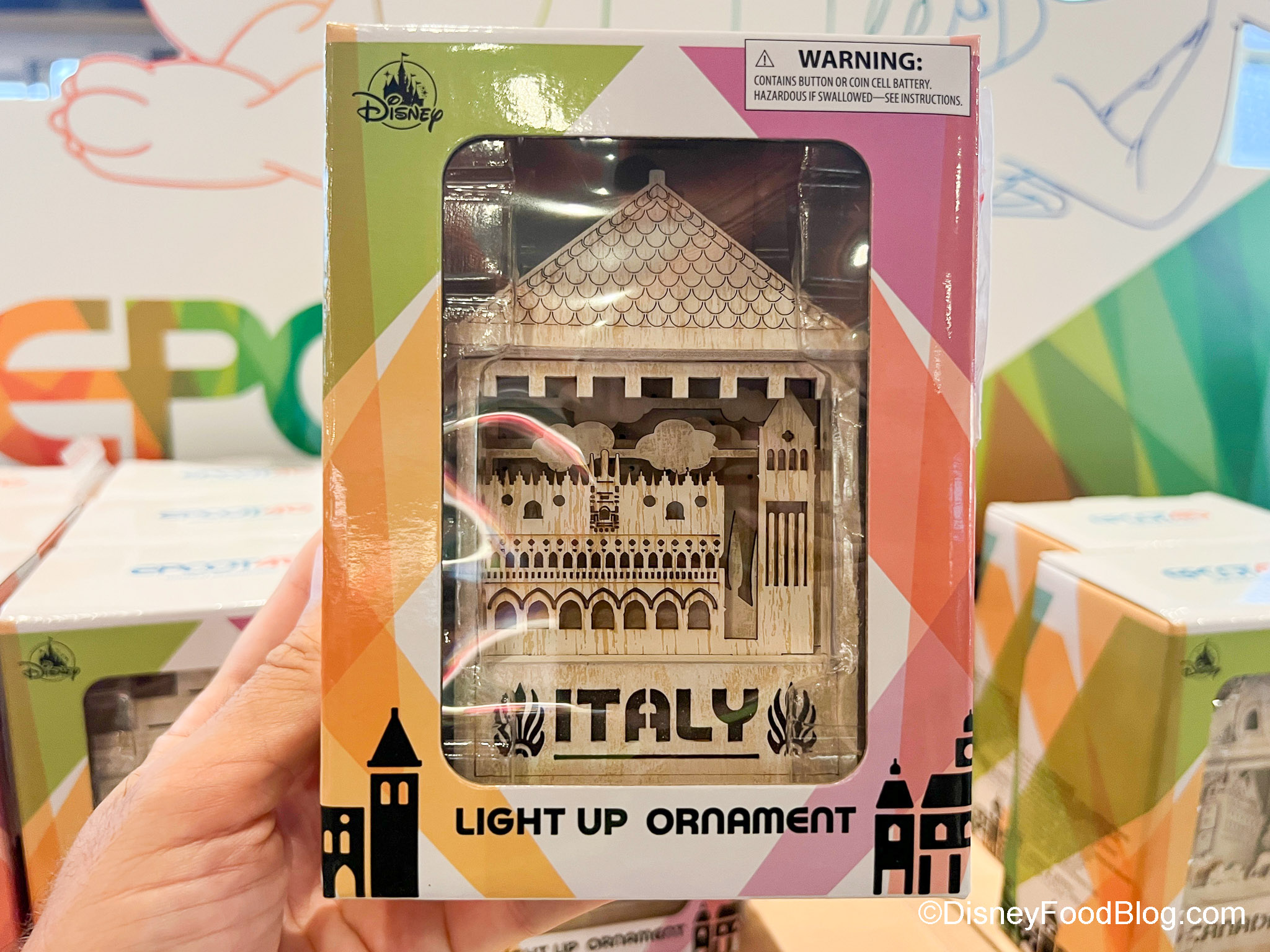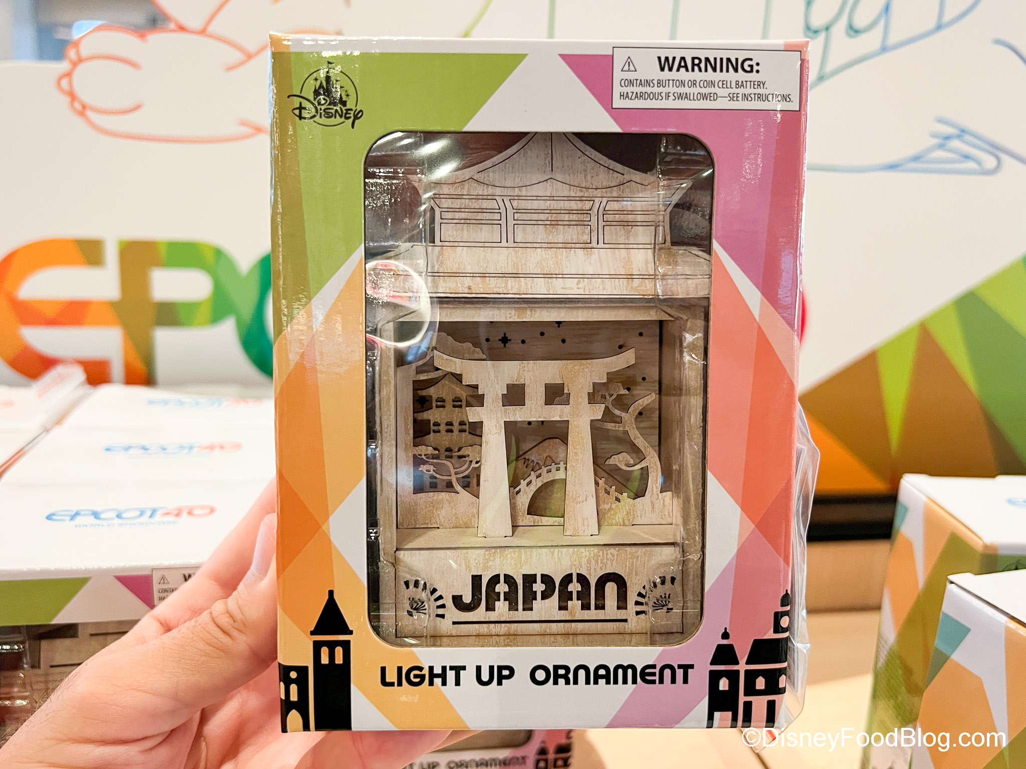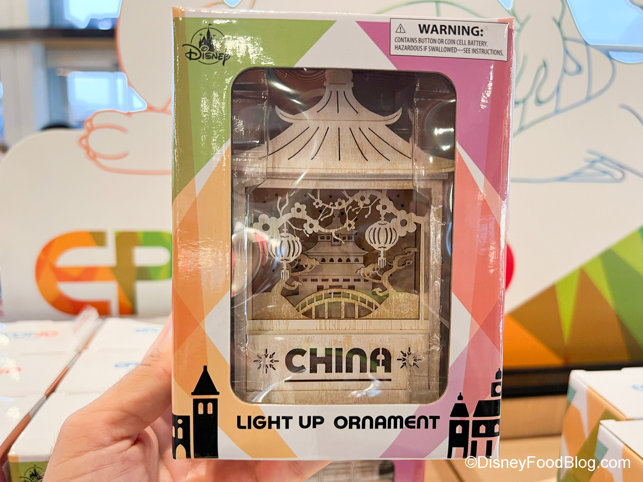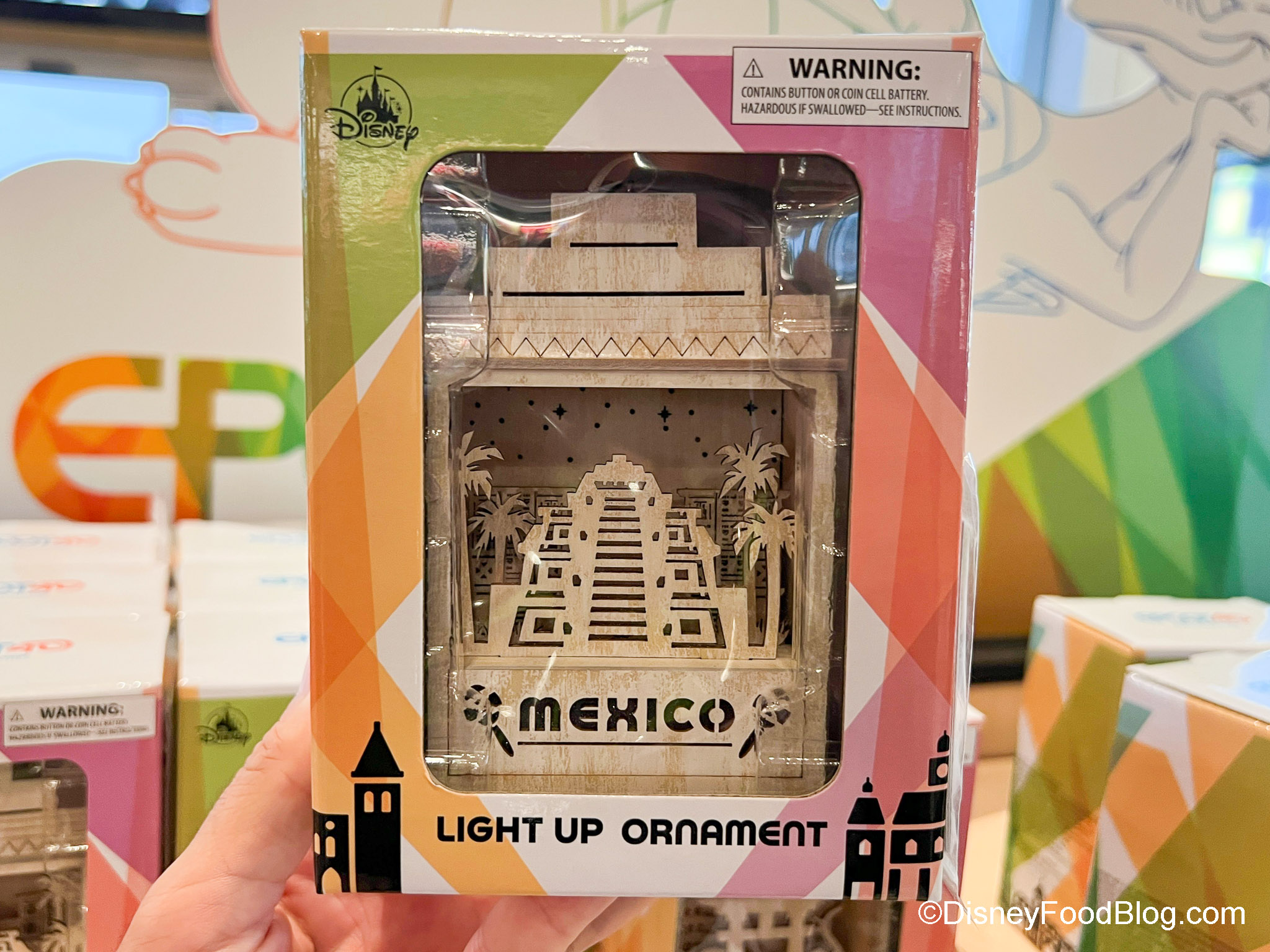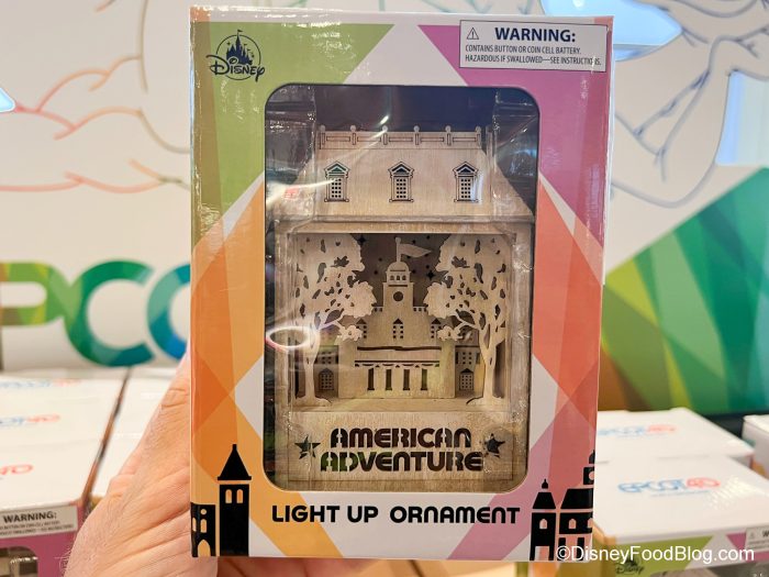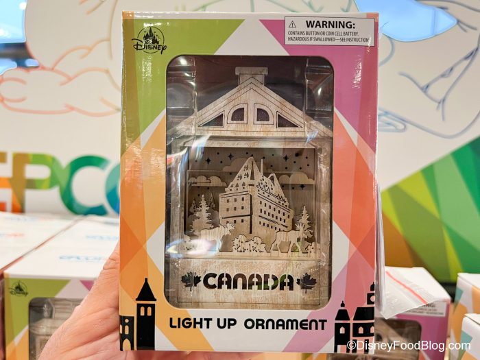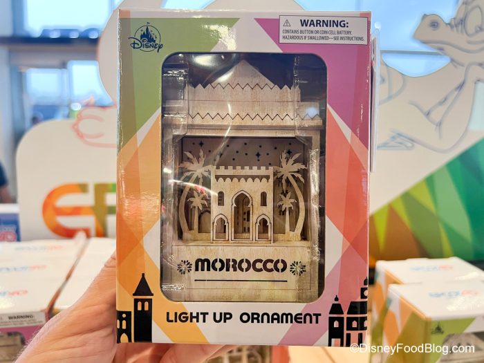 Here’s the thing, though — EPCOT has 11 World Showcase Pavilions, but we only found 10 ornaments (sorry, Germany — but we’ll keep an eye out for you!). But you can get ornaments for all the other countries! Each ornament has a little diorama of its pavilion on it — and each lights up! There’s Mexico…
