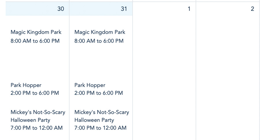 We’re starting in Magic Kingdom, where on October 30th & 31st the park will be open from 8AM to 6PM due to Mickey’s Not-So-Scary Halloween Party, which runs from 7PM to 12AM on those dates.