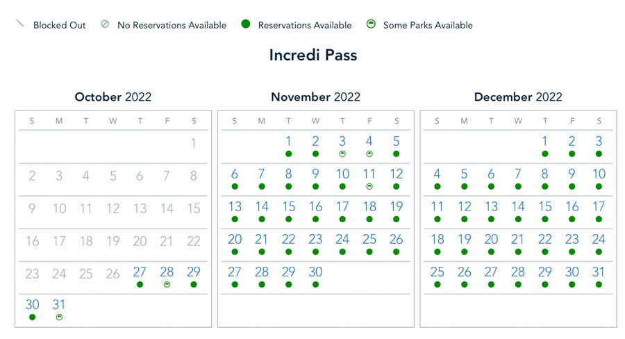 If you’re a Disney World Annual Passholder you have a different calendar of park pass availability. Next week, the Incredi Pass has no blockout dates, but it is booked up for Magic Kingdom on October 31st, and Hollywood Studios on November 3rd & 4th.