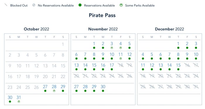 If you have the Pirate Pass you also have no blockout dates and every day is fully available, except for Magic Kingdom on October 31st, and Hollywood Studios on November 3rd & 4th.