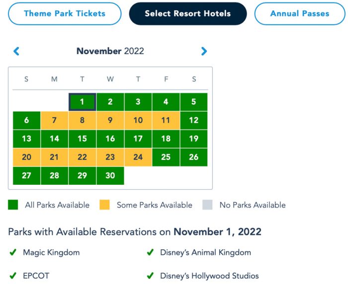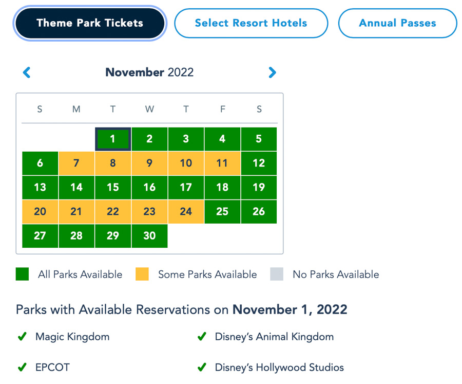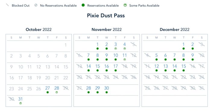 And, the Pixie Dust Pass is blocked on October 30th & November 5th. Magic Kingdom is booked up on October 31st, and Hollywood Studios is booked up on November 3rd & 4th.