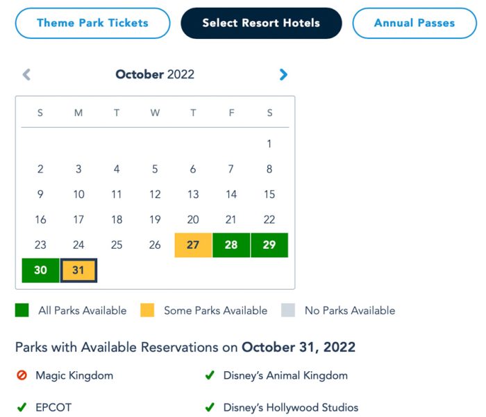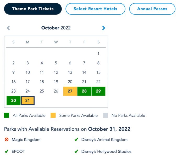 If you’re staying at a Disney World hotel, the availability is the same as it is with the theme park tickets. Magic Kingdom is booked up for October 31st…