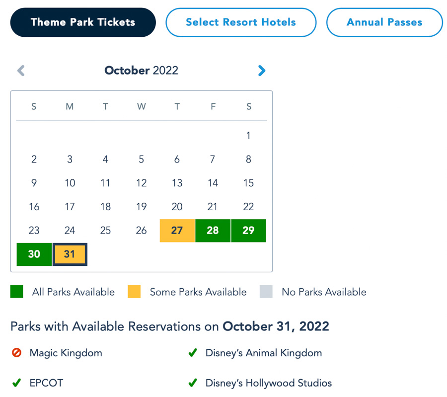 The Disney World Park Pass availability calendar is divided by theme park tickets, resort hotels, and Annual Passes. For visitors with Theme Park Tickets, Magic Kingdom is booked up for October 31st…