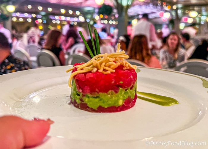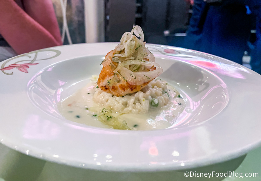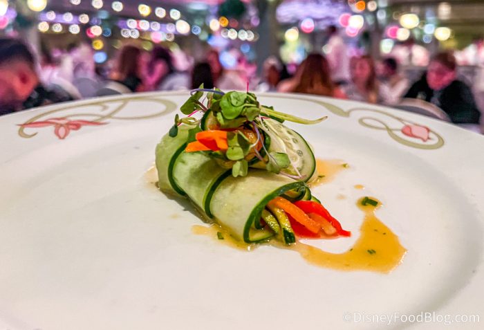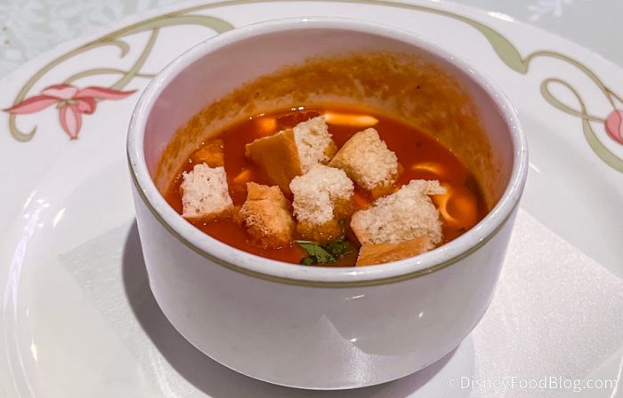 We started off with the bread service here, which is similar to the bread service at the other two rotational restaurants on the Disney Dream — Royal Palace and Animators Palate. We got a variety of rolls that were pretty standard and were served at room temperature. We really wish the bread would’ve been warm!