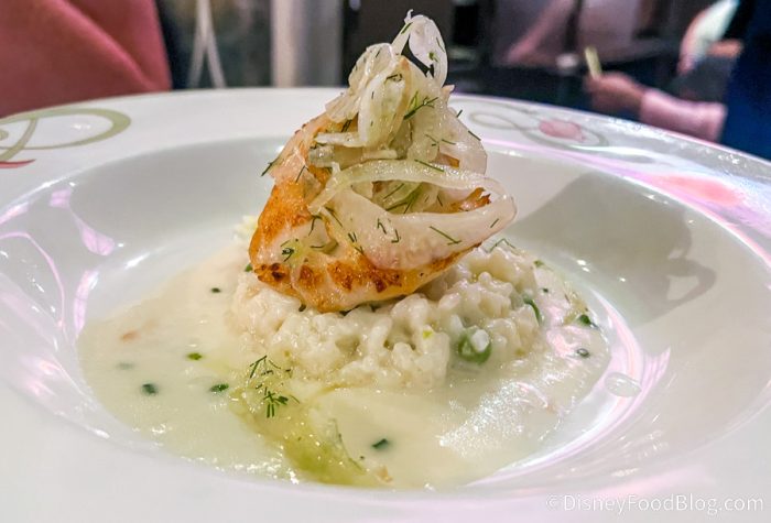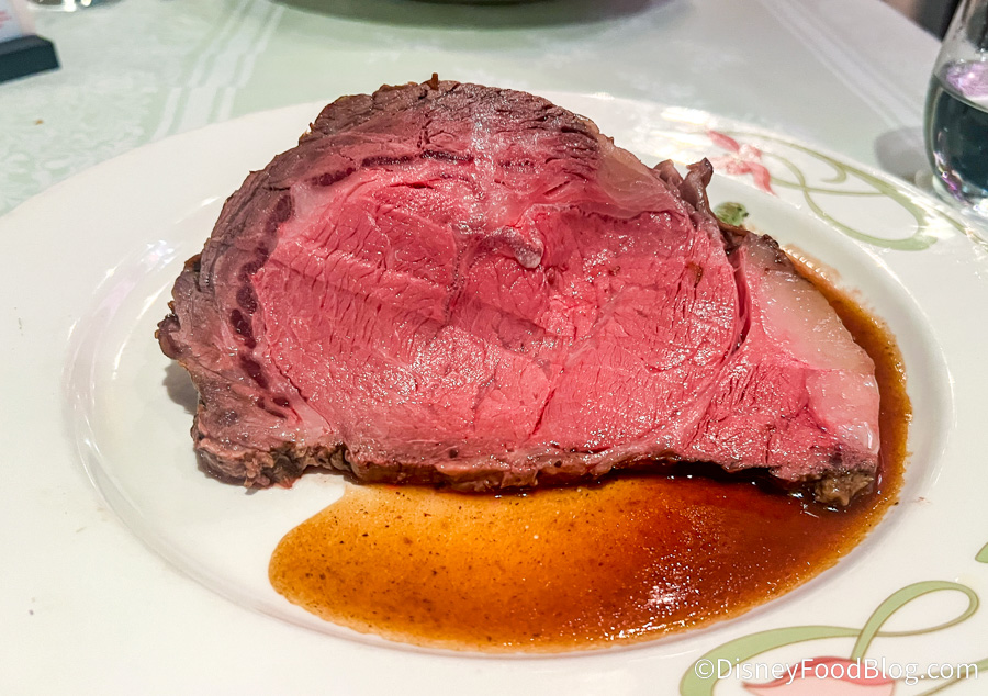 For our entrees, we got the sea bass and the slow roasted prime rib. We were really looking forward to the sea bass, because the sea bass on the Disney Wish was one of our favorite things we ate, so we had high hopes for this version. However, we were slightly disappointed. It just didn’t have a ton of flavor! But, the fish was cooked well and was super flaky — it fell right apart. The fennel and dill chive wine sauce just wasn’t adding enough flavor for us, even though we’re fans of those flavors.