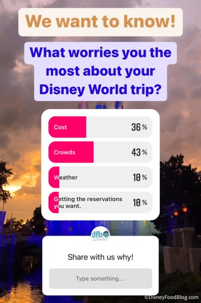 We asked Disney fans “what worries you the most about your Disney World trip?” and we got a TON of responses. On Instagram, we took a poll for 4 of the most popular reasons, and it looks like people are mostly worried about crowds, with cost coming in second.