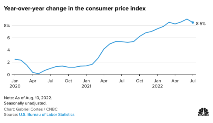 Inflation continued to slow down in August of 2022, as gas prices continued to drop. But, even though gas was down in price, a lot of other things became more expensive, like rents, new cars, and medical care services. Consumer prices were raised by 8.3% in August of 2022 compared to August of 2021. But, this was still lower than June and July of 2022. However, groceries went up by 0.7% from July to August.