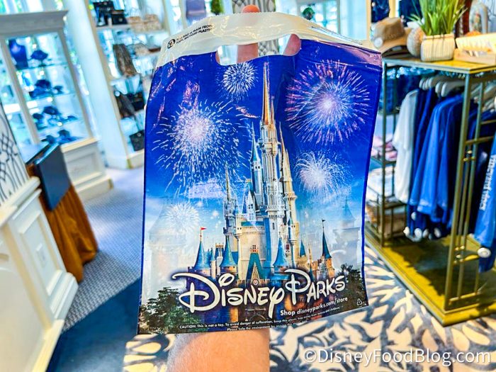 One place that DID still have small plastic bags was Curiouser Clothiers in Disney’s Grand Floridian Resort. So, it seems like the method for getting rid of these bags is different across the resort. Some spots returned their bags, and some places are waiting until they run out of them.
