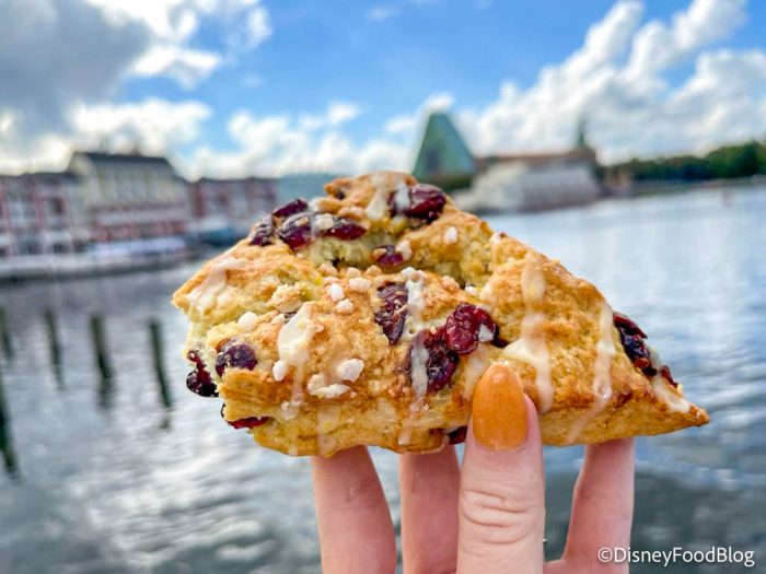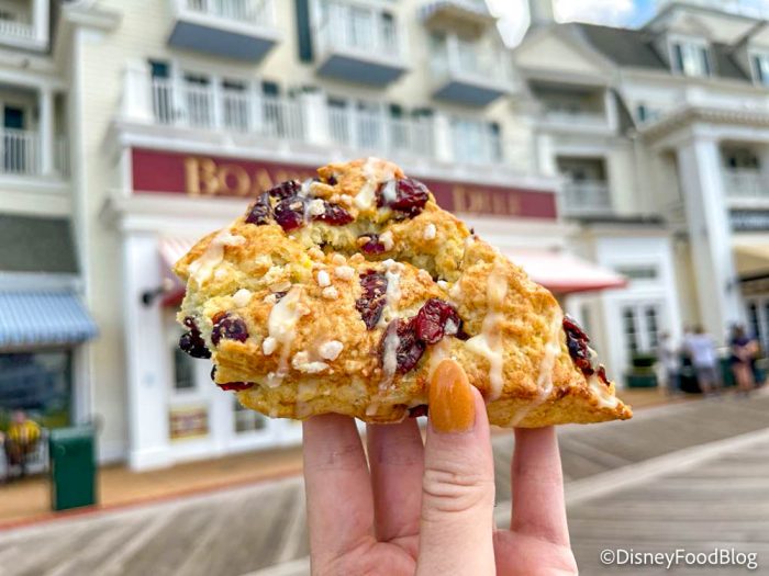 Also available at BoardWalk Deli is another item Disney has marked as “new” — the Orange Cranberry Scone with orange glaze. It’s priced at $3.79. This is another treat we’ve seen versions of in the past. At Creature Comforts in Disney’s Animal Kingdom, we spotted a Cranberry Orange Scone back in 2020. But how would this “new” version hold up? We had to try it to compare!