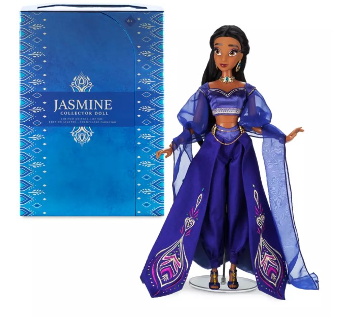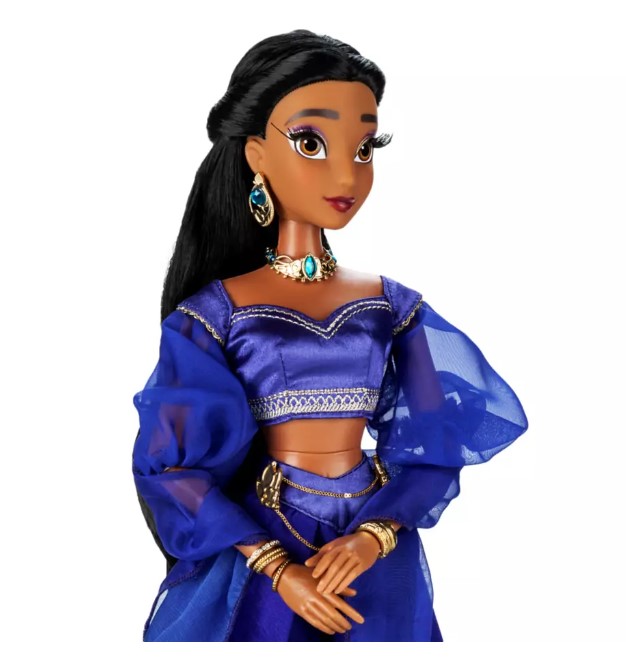 The brand-new Jasmine Limited Edition Doll is available for pre-order on shopDisney. Designed for Aladdin‘s 30th Anniversary, Jasmine looks stunning in a detailed storybook ensemble designed by Disney artists. Her outfit is an upgraded take on her classic two-piece in a rich royal blue with peacock accents similar to the costumes from the live-action adaptation. This 17-inch doll comes complete with matching shoes, gold accessories, and a stand for display.