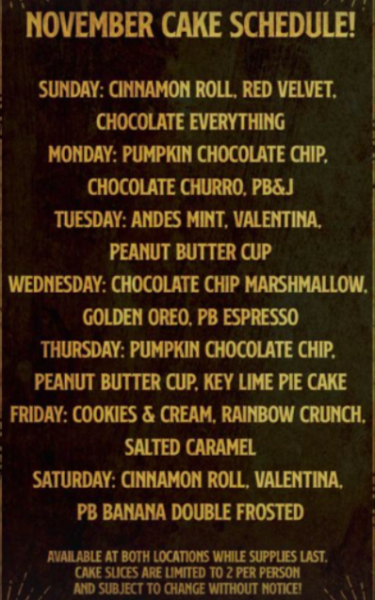 Sunday will have Cinnamon Roll, Red Velvet, and Chocolate Everything cakes; Monday features Pumpkin Chocolate Chip, Chocolate Churro, and PB&J flavors; Tuesday is Andes Mint, Valentina, and Peanut Butter Cup; Wednesday will have Chocolate Chip Marshmallow, Golden Oreo, and PB Espresso cakes; Thursday has Pumpkin Chocolate Chip, Peanut Butter Cup, and Key Lime Pie Cake; Friday is all about Cookies & Cream, Rainbow Crunch, and Salted Caramel; and Saturday will have Cinnamon Roll, Valentina, and PB Banana Double Frosted cakes.