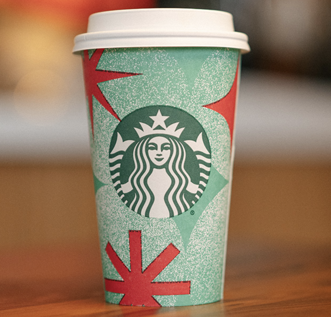 This new cup design is the Frosted Sparkle, which has a retro look with red starbursts and diamond shapes on a mint green background.