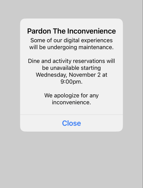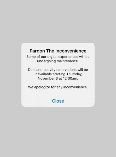 The pop-up says āSome of our Digital experiences will be undergoing maintenance.ā It goes on to say āDine and activity reservations will be unavailable starting Thursday, November 3rd at 12:00AM.ā