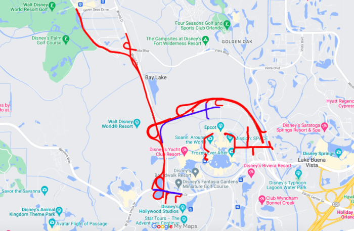 One way to avoid the road closures around EPCOT is to stick to Disney transportation, like the Monorail or Skyliner. You could park at the Transportation and Ticket Center and take a Monorail from there to EPCOT. There are Skyliner stations at several Disney hotels and at Disney’s Hollywood Studios, so you could go to one of those stations and ride the Skyliner to EPCOT.