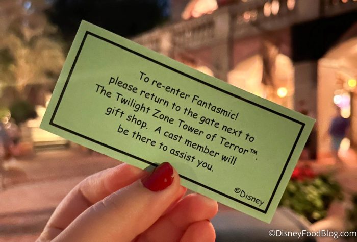 Also, just as a note. We were able to step outside of the theater. When we asked a Cast Member if we could step out, we were given this sheet of paper. Now, this may not be guaranteed, but if you need to step outside of the theater, you may want to ask to see if this is an option.