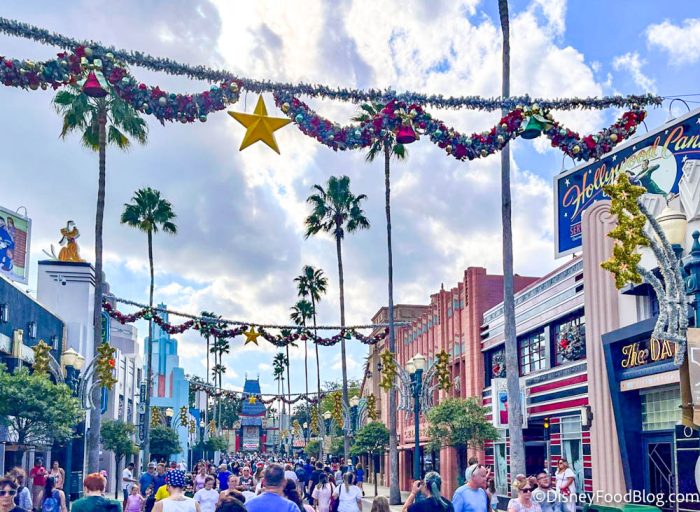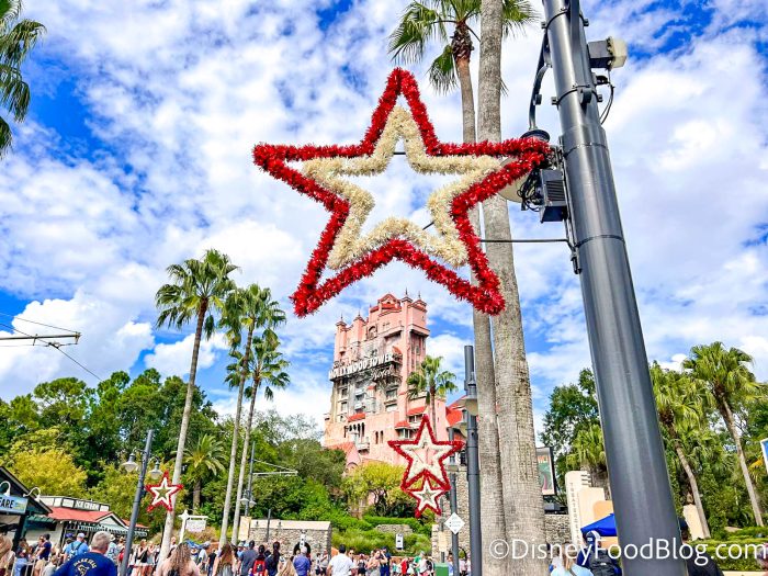 The first holiday decorations appeared in Hollywood Studios before Halloween, on October 27th. However, this round of decor only included the red and silver stars on Sunset Boulevard.