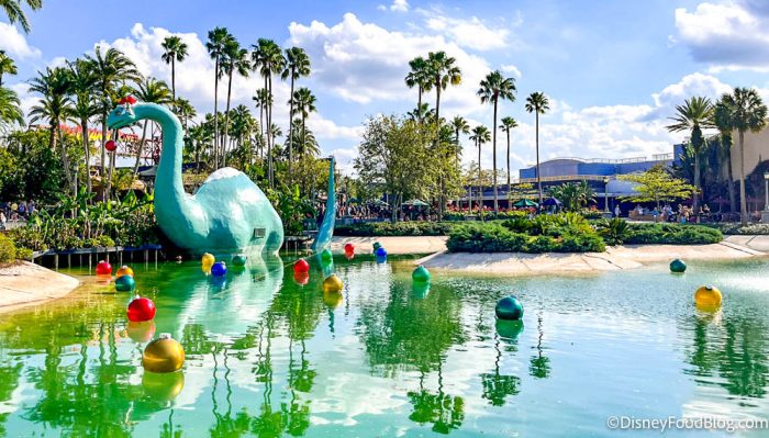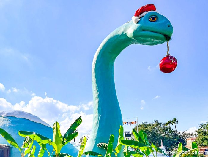 Once we reached Echo Lake, we saw that this area was also ready for the festive season. Dinosaur Gertie has donned her Santa hat and is holding an ornament in her mouth (which has Disney World’s 50th anniversary logo on it).