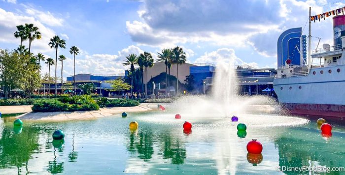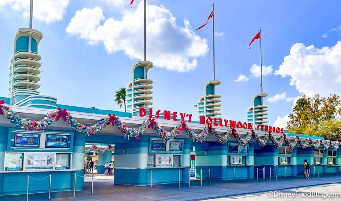 When we visited Hollywood Studios today, we saw a LOT more festive cheer in this park! The first thing we noticed was the big garland right at the entrance, which is full of colorful ornaments.