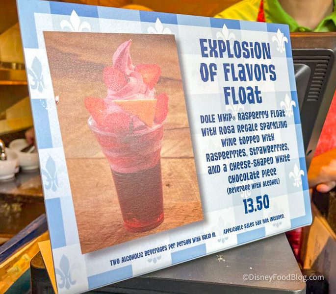 It’s made with Dole Whip raspberry in Rose Regale Sparkling Wine and is topped with strawberries, raspberries and a cheese-shaped wedge of chocolate. pic.twitter.com/m8woFL8lFk