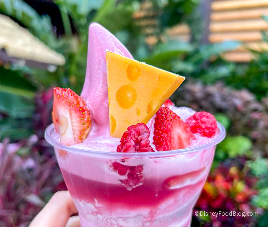 It’s made with Dole Whip Raspberry, Rose Regale Sparkling Wine, and is topped with strawberries, raspberries, and a cheese-shaped wedge of chocolate for the Wine & Dine theme! But, how does it compare to the OG Dole Whip?