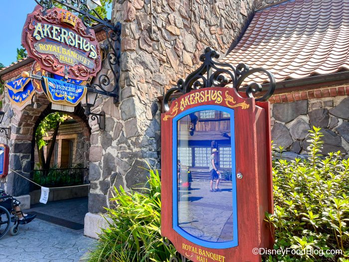 We were able to get a dining reservation at Akershus Royal Banquet Hall on reopening day, so stay tuned for our FULL review. For now, let’s see what the reopened Akershus is like! Cast Members were stationed out front celebrating the restaurant’s reopening!