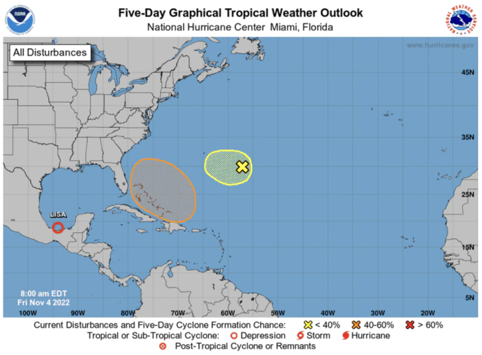 As of November 4th, the chances for the formation of a storm within the next five days have increased by 40%. Forecasters are predicting that a “large nontropical low pressure system” will develop over the northeastern Caribbean Sea and southwestern Atlantic near Puerto Rico.