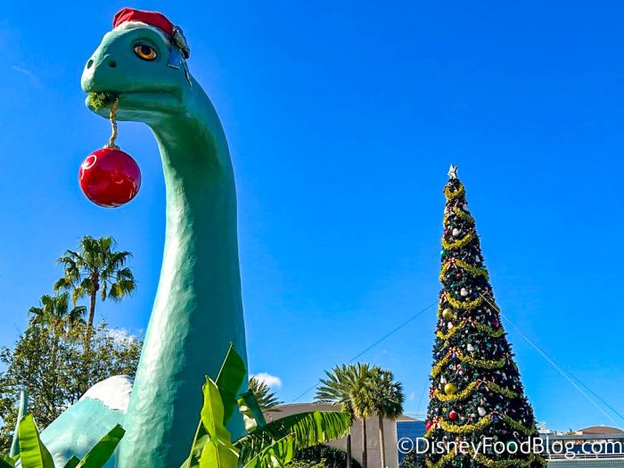 Today, that tree has arrived! You’ll find it in the Echo Lake area of the park, surrounded by floating giant ornaments and near Gertie the dinosaur in her Santa hat.