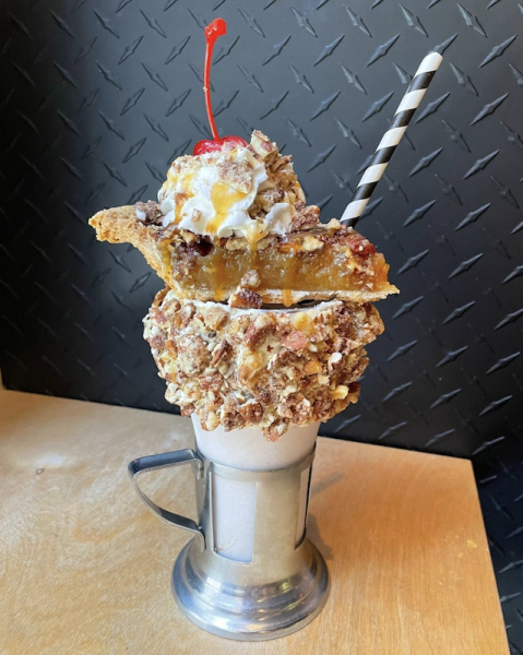 The Pecan Pie Crazyshake has a vanilla frosted rim with Texas glazed pecans and is topped with a slice of pecan pie, whipped cream, caramel drizzle, and a cherry!
