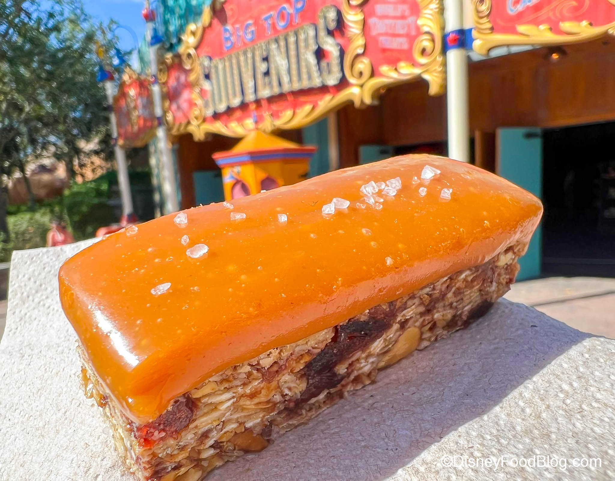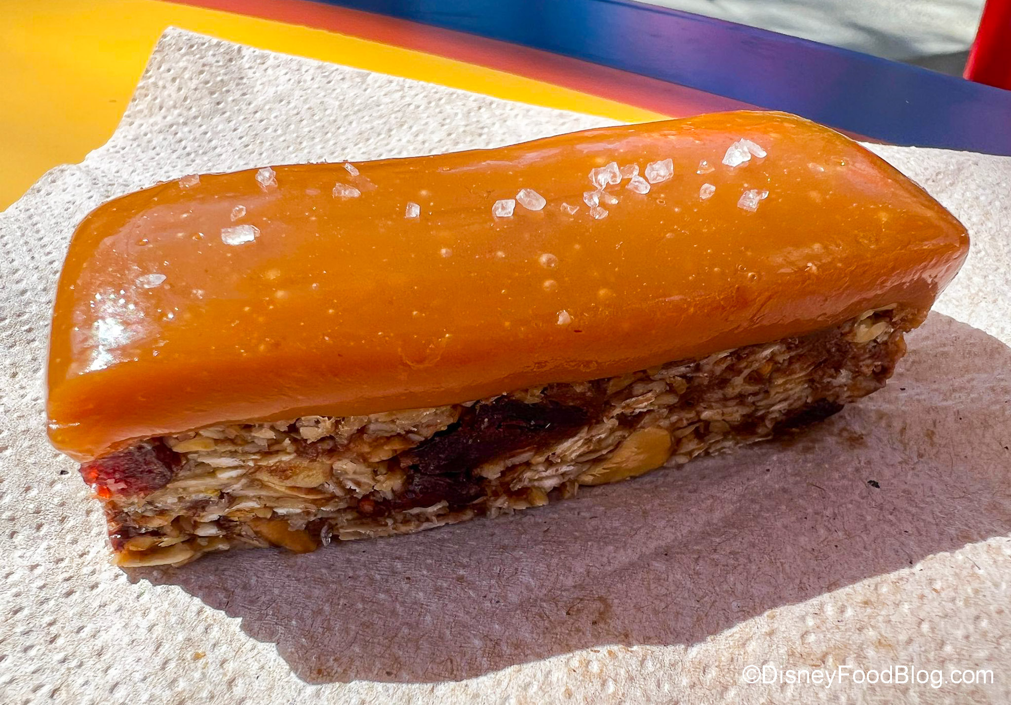 So this snack is a Werther’s Caramel Bar (Disney didn’t have an official name for the treat, so this is what we’re going with!). But we’ve never tried it before, so we got it! But once we got it, we realized that it’s sort of like a thick, but moist, granola bar with a ton of caramel on top.