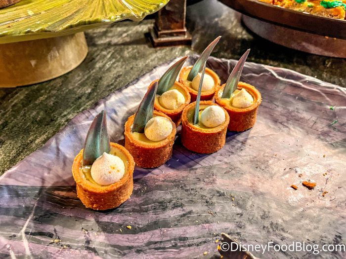 Finally, we’ve got the pineapple tart. We loved the presentation. onthis treat, and the filling was smooth and delicious, but didn’t have a very strong pineapple flavor. It’s served with a graham cracker base and topped with a meringue dollop and a white chocolate leaf.