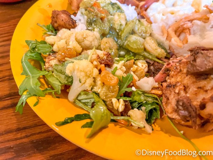 We had two different cauliflower options to try, starting with the Cauliflower Salad. It was very light, made with feta and arugula, as well as a light, sweet dressing. There were raisins sprinkled throughout. We loved most of the flavors of this, but that arugula was a little overpowering for the mix. We think it would be a bit nicer with a milder green, that way the other flavors can really shine.