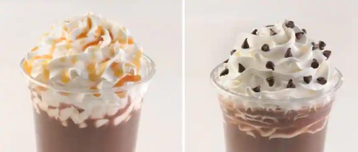 - Frozen Hot Chocolate with Peppermint Soft-serve: Frozen hot chocolate, peppermint soft-serve, and white chocolate peppermint bark (New)