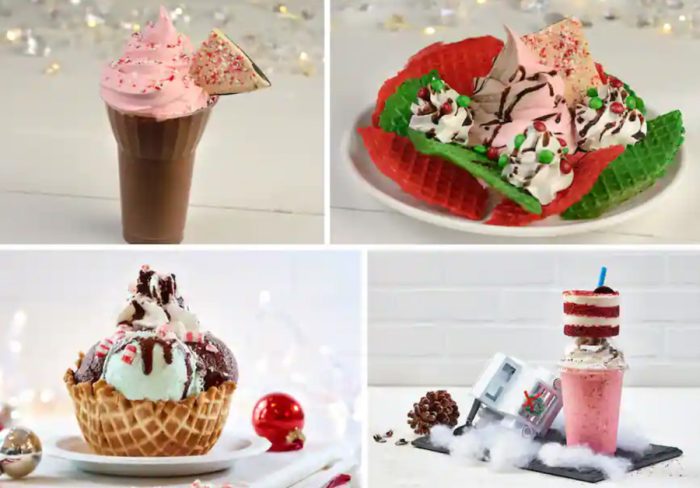 - Santa’s Little Helper Sundae: Two scoops of chocolate, mint chocolate chip, chocolate sauce, crushed peppermint, and whipped cream (Available November 1st through January 3rd)