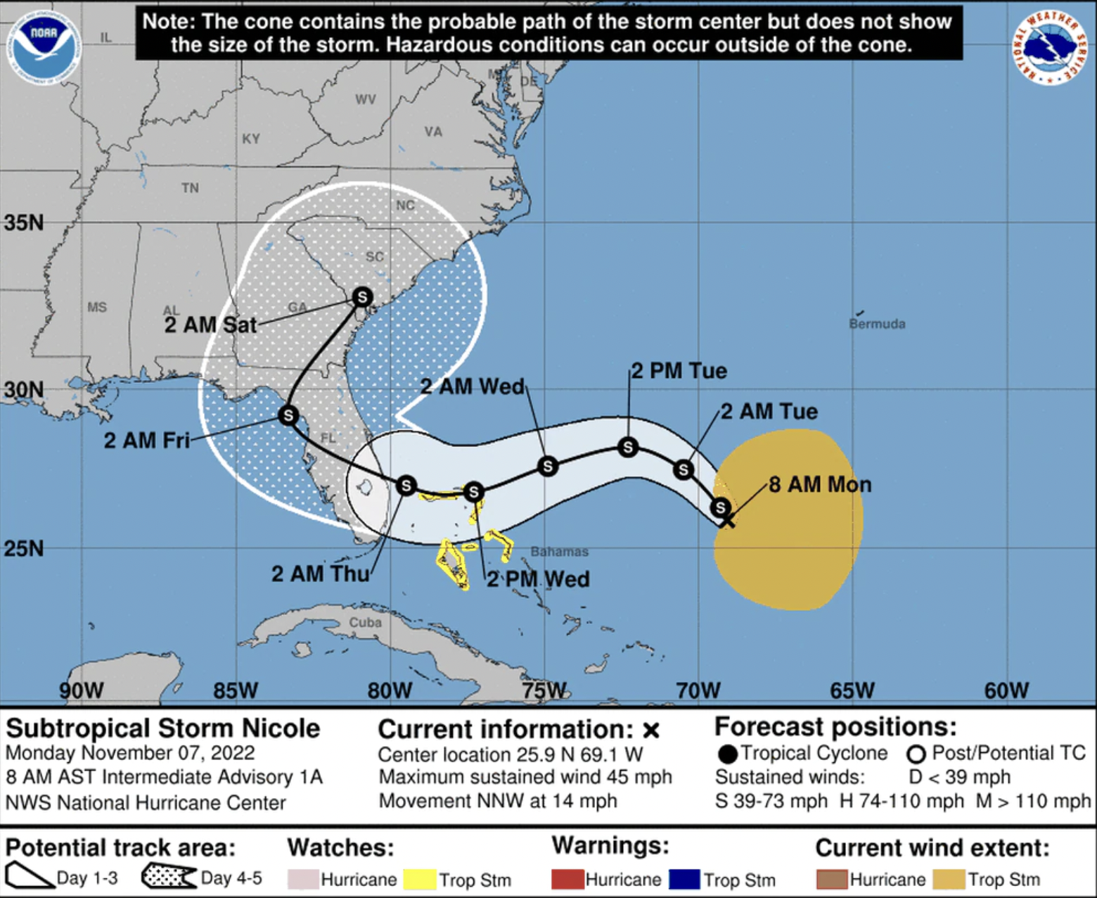 Currently Nicole is a subtropical storm with 40 mph winds as far out as 275 miles. Experts predict that the storm will transition to a tropical system with higher wind speeds within 2-3 days. According to the Orlando Sentinel, National Hurricane Center senior hurricane specialist Robbie Berg said, “It’s not out of the question for Nicole to reach hurricane strength, especially given how warm the waters are in the vicinity of the Bahamas.”