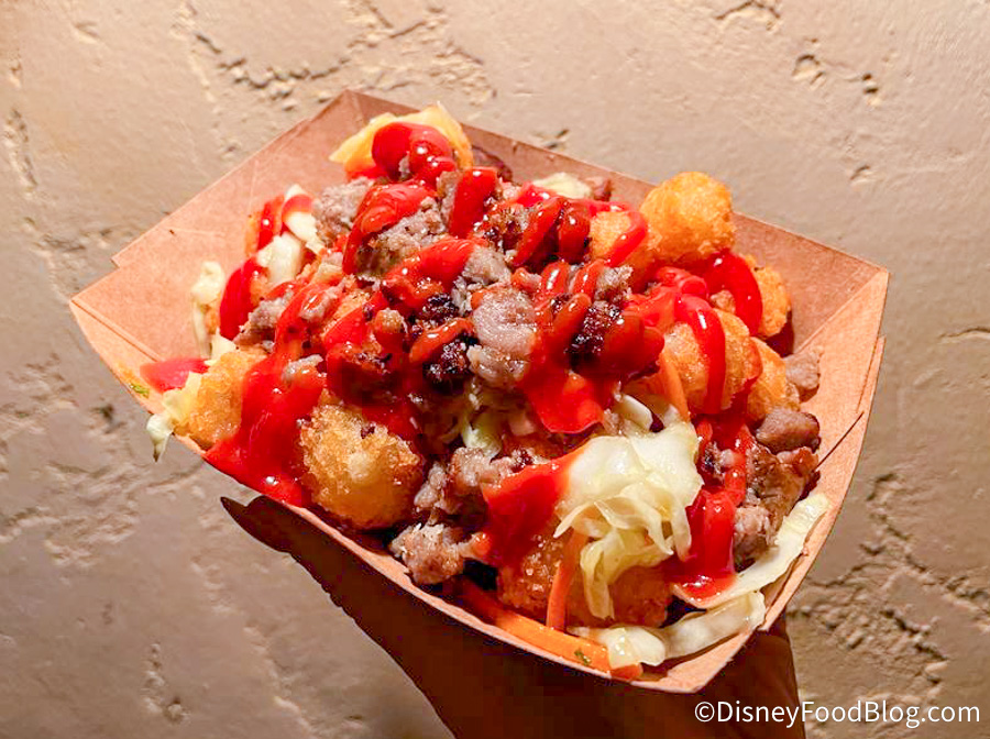 Mickey’s Very Merry Christmas Party is home to plenty of exclusive eats, and we’re heading over to The Friar’s Nook in Fantasyland to see what they’re serving up! First up are the Curry Brat Tots — tots topped with chopped bratwurst, curry ketchup, and apple slaw for $11.49.
